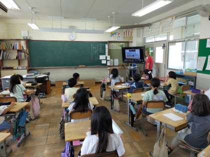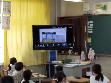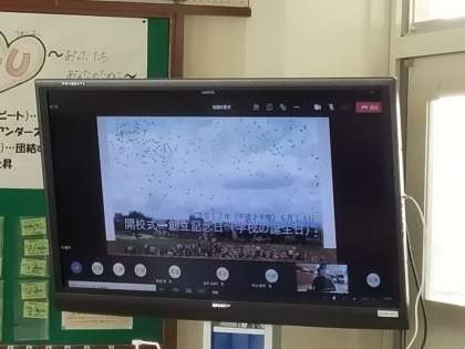 今日の児童集会、校長の話は、6月17日の創立記念日にちなんで、統合から今までの北条小の歩みを、パワーポイントで話しました。