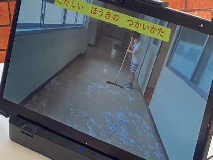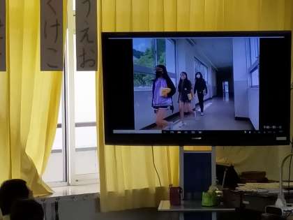 委員会からの発表は、前もって作成した動画で、校舎内の安全を伝える保健委員会、掃除の仕方を紹介する環境委員会がありました。よくできた動画で、おもしろかったです。
