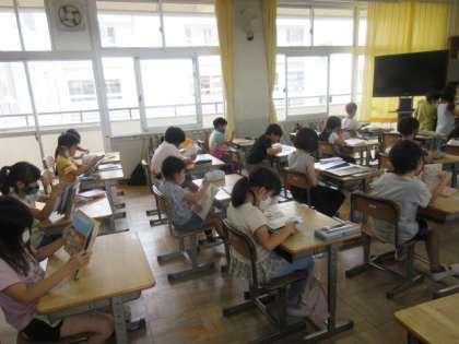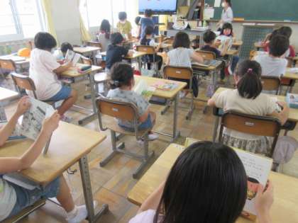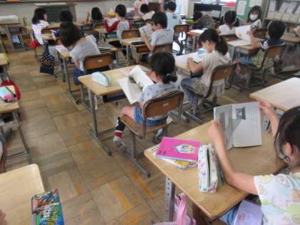 図書の時間、図書室で借りてきた本を静かに読んでいる子どもたち。後ろからそっと、何を読んでいるのかなーと、いっしょになって読んでいたら。なんと怖い話でした。少し、怖かったです。