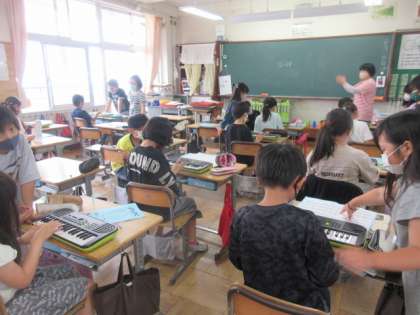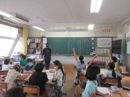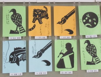 4年生の教室に入ると、ことわざの切り絵が並んでいました。黒が利いていて、かっこいいですね。ことわざかるたから選んだそうです。4−2は、国語、4−1は音楽の授業でした。