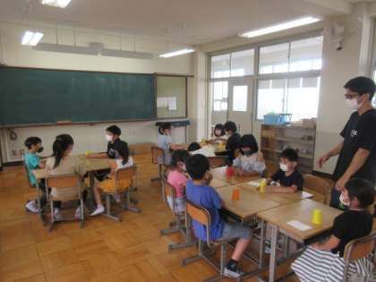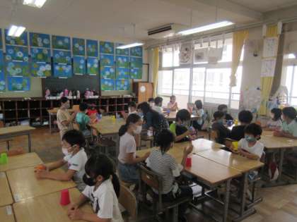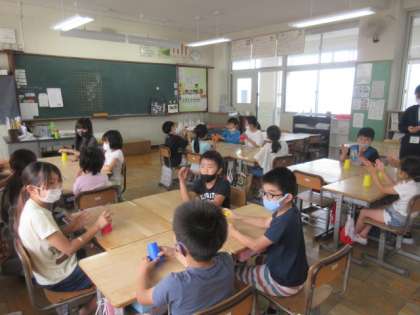音楽でカップを使ったリズムに取り組んできた4年生が、きょうだい学年の2年生にやり方を教えてあげました。4年生の教え方がとってもやさしいことに感心しました。