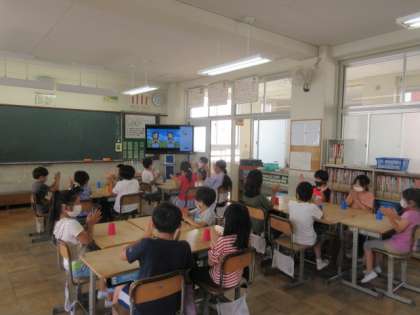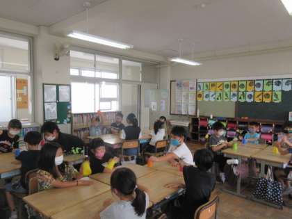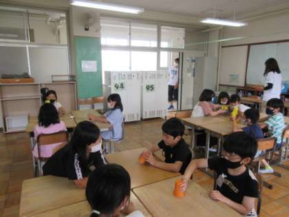 覚えたら、音楽に合わせてやってみます。はじめはゆっくりから。だんだん速くしていきます。2年生と4年生の教室がある3階フロアに、パコパコパコという音が響き渡っていました。