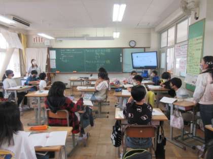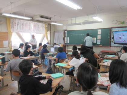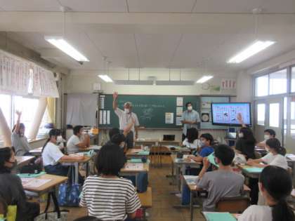 6−1は、外国語の時間。北条中学校のAETの先生が黒板に描いた絵のことを、英語で答えます。英語はもちろん難しいですが、その上を行くのが、先生の描いた絵。難解です。
