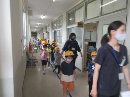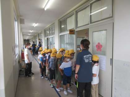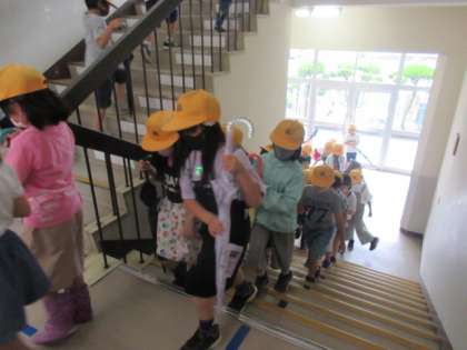 今日は、風水害避難訓練を実施しました。学校にいる間に警報等が出て、下校しなければいけないという想定です。児童玄関が混雑しないように、まず下靴に履き替え、傘を持ってきます。