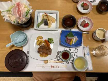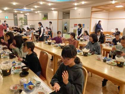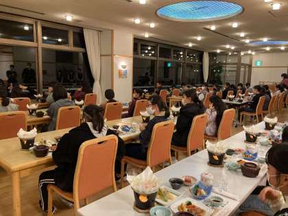 ここでも、前向き、黙食。修学旅行の夕食とは思えないほどの静かさ。風の音だけが聞こえてきます。