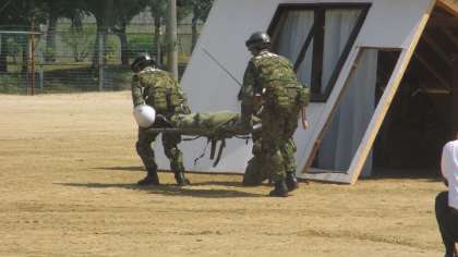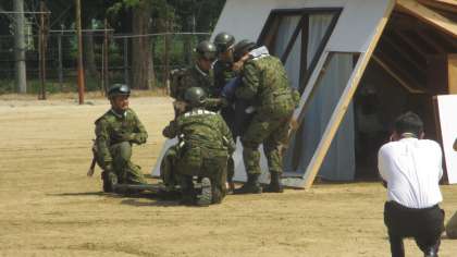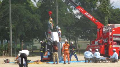 自衛隊による倒壊家屋からの救出や消防署レスキュー隊による自動車からの救出を見せてもらいました。
