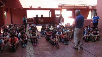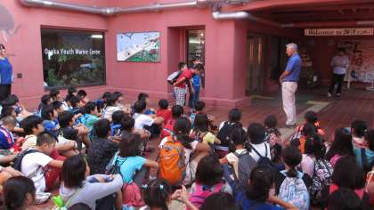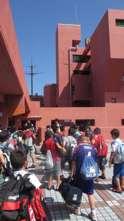 7日朝、学校で出発式をした後、大阪府泉南郡岬町にある大阪府立青少年海洋センターに向かいました。出発式では、保護者の皆さま、お見送りありがとうございました。海洋センターに到着すると、真っ青の空と海。晴天。さっそく開校式です。