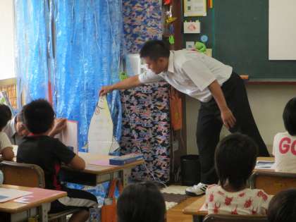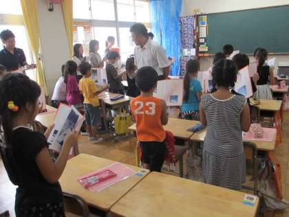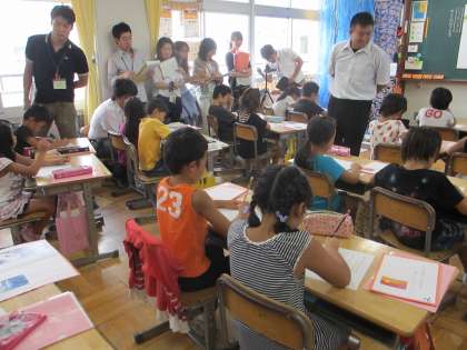 9月10日(水)校内授業研究会を2年2組宮宗学級で行いました。国語説明文「さけが大きくなるまで」を教材に、さけが海から川の上流へとのぼる様子について学習しました。教室には、本文中にある3mの滝を表したしかけやビデオが用意され、子どもたちの理解やイメージを助ける工夫がありました。子どもたちも一生懸命に学習しようという意気込みが伝わってきました。
