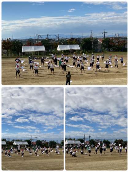 運動会練習の様子です。フラッグの使い方が上手になってきています。みんなでタイミングを合わす練習をたくさんしています。