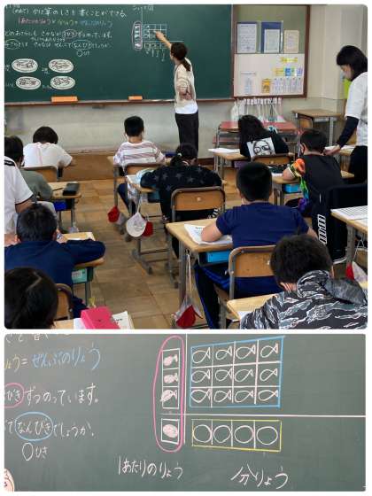 2年生では「1あたりの量、分量、全部の量」に注目して式を立てるように教えています。シェーマ図(写真下部)を書きながら授業を進めています。