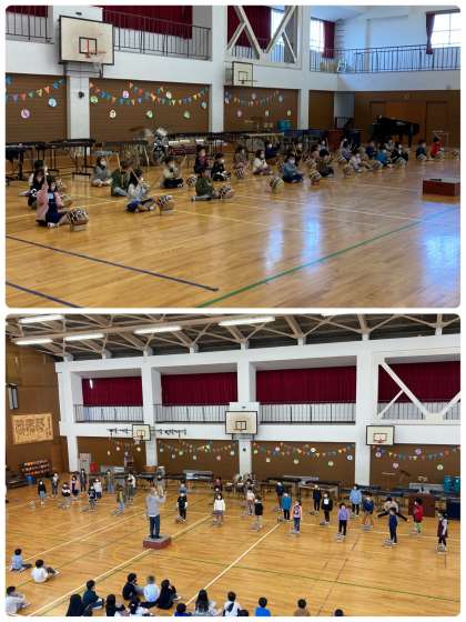 オープニングは1年生です。元気いっぱいの太鼓演奏です。ドンの音がきれいに合わさっていました。2曲目は江州音頭〜北条小バージョン〜です。自分たちで考えた歌詞を太鼓に合わせて歌いあげました。会場が祭り拍子で盛り上がりました。