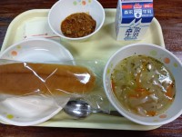 今日の給食は、ごはん、米粉カレーシチュー、コーンソテー、牛乳です。