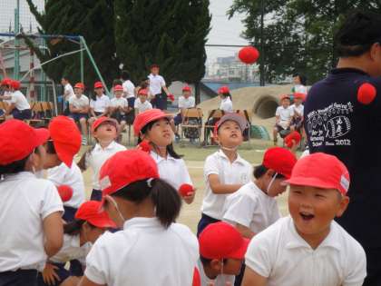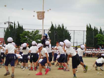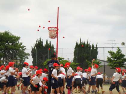 一生懸命、楽しそうに赤白の玉を投げ入れていました。練習では赤組が勝っていましたが、当日は2対0で白組が勝ちました。
