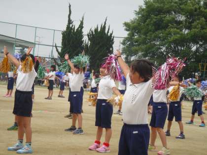 運動場いっぱいに元気なダンスを披露してくれました。かわいい振付とにこにこ笑顔がとてもよかったです。隊形移動をして、保護者の皆さんにも正面から見てもらえるように工夫しました。