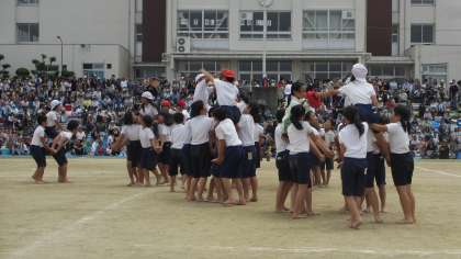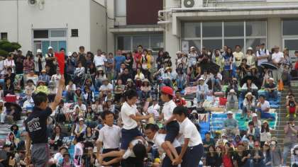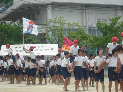 5・6年生合同の競技です。学年ごとの対戦は紅白1勝1敗。一騎討ちは赤の勝ち。大将戦は白の勝ちで引き分けでした。作戦あり、見ていてとても楽しませてもらいました。