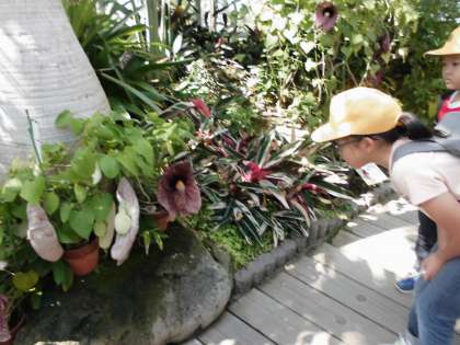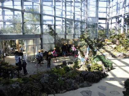 さて、鶴見緑地では、まず『咲くやこの花館』で、植物を見ながらクイズ形式のウォークラリーをしました。自分たちで表示を見たりして答えを探す班や、スタッフの方に質問して探す班や、どの班も協力できていたように思います。大きな蓮の葉『オオオニバス』や世界最大の『ラフレシア』に驚いたり、高山植物エリアの涼しさを経験したりと、大満足でした。