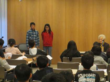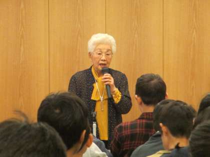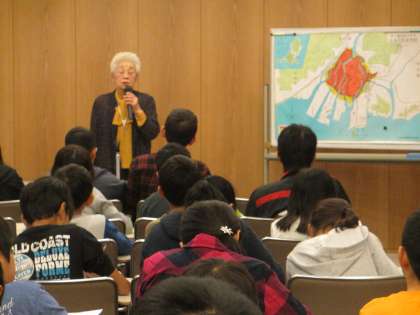 高等女学校2年生(14歳)のとき被爆された植田規子さんにお話を伺いました。現在は85歳になられます。当時女学校の生徒だった植田さんですが、勤労奉仕で爆心地から1.5km離れた工場で被爆されました。ピカッとなった瞬間、近くに爆弾が落ちたと思って、目と耳を手でふさいで伏せたそうです。先生と一緒に山に逃げられ、野宿。翌日に家に帰ろうとしたが家はなかったそうです。途中、川にはたくさんの死体が浮いていたと当時の様子をお話してくださいました。お話を聞いた後、子どもたちはたくさん質問をしていました。