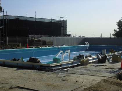 プールの改修工事が進んできました。プールの中はもう、しっかりと水色の防水が貼られ、プールサイドや機械室の工事に入っています。