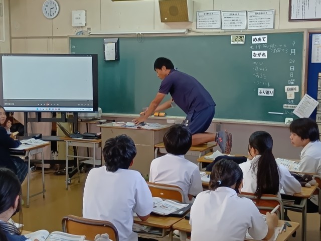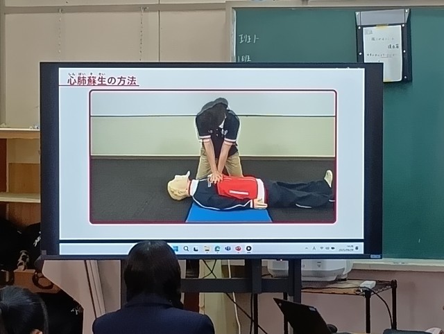 心肺蘇生法について、学んでいるところでした。先生方も毎年講習を行うとても大切な内容です。知識だけでなく実際にできるよう、しっかり学んでほしいです。