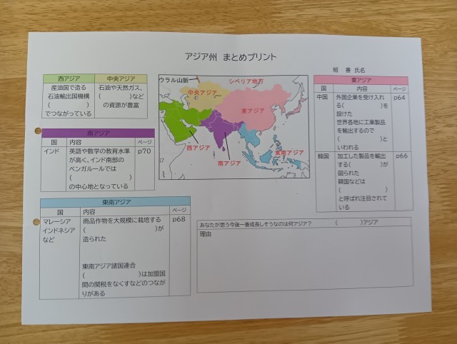アジア州のまとめプリントを真剣に解いていました。集中している姿が素晴らしかったです。