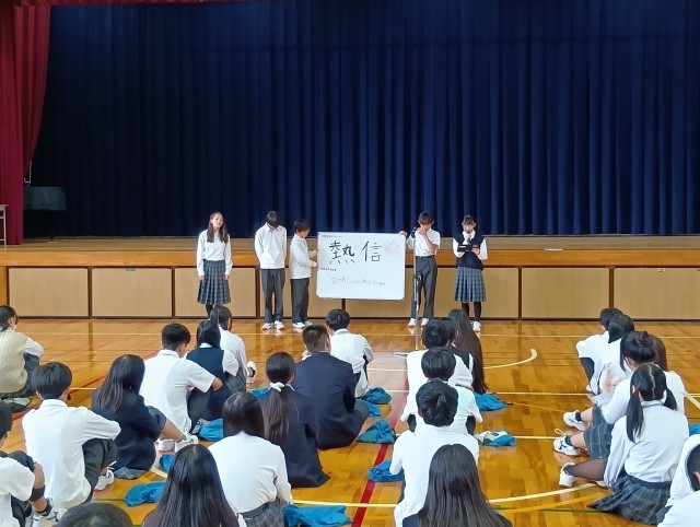 「熱信(ねっしん)」に決まりましたと生徒会役員から報告がありました。このスローガンのもとみんなで力を合わせて北中を盛り上げていきましょう!