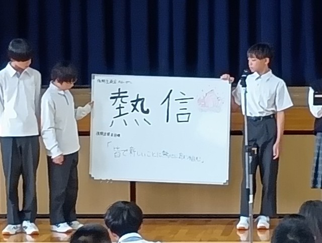 今日の生徒集会では、後期生徒会のスローガンの発表がありました。