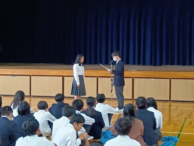 全校生徒の前で堂々と話をしている姿が立派でした。