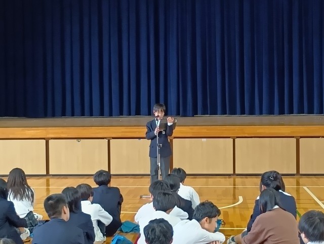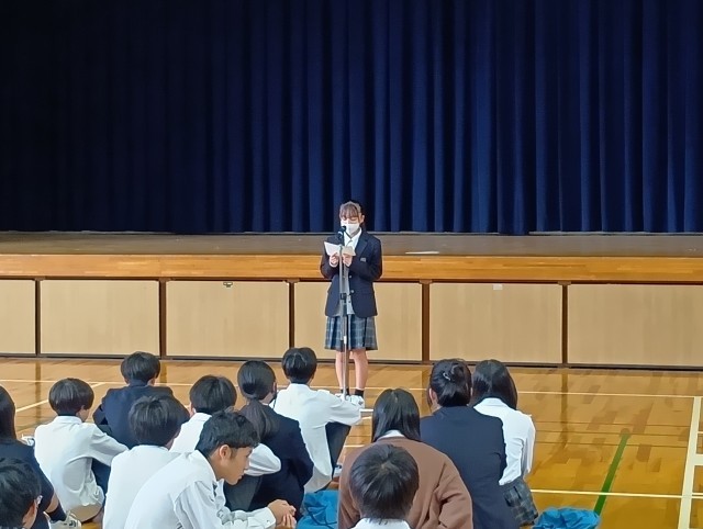 生徒集会では、図書委員会から文化祭でのビブリオバトルの表彰、体育委員会から昼休みの体育館開放、生徒会から生徒議会の話がありました。
