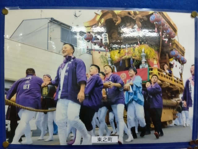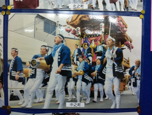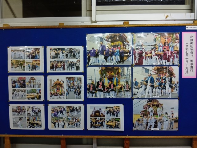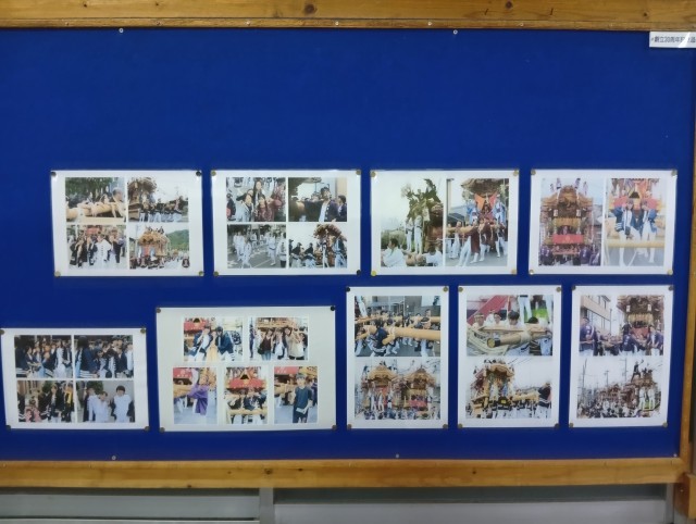 そのようすを会議室前の掲示板に掲示しています。先生方は、事前の太鼓練習のようすや秋祭り当日も見に行かせていただきました。地域にこのような大きな祭りがあることが何より素晴らしいです。