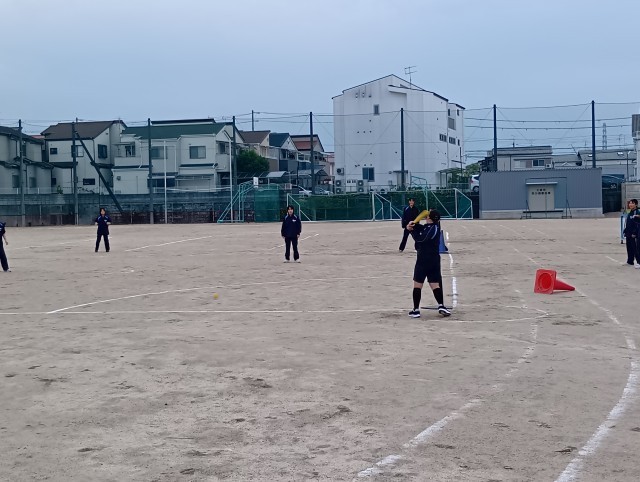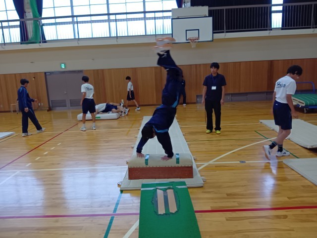男子は体育館で器械体操、女子はティーボールをしていました。