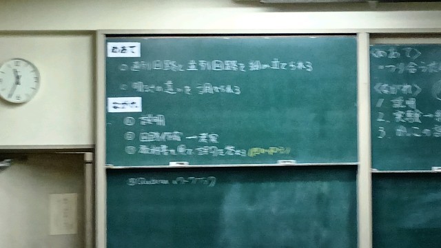直列回路と並列回路を組み立てる実験をしたあとにまとめをしているところでした。