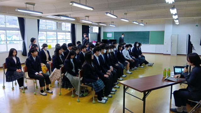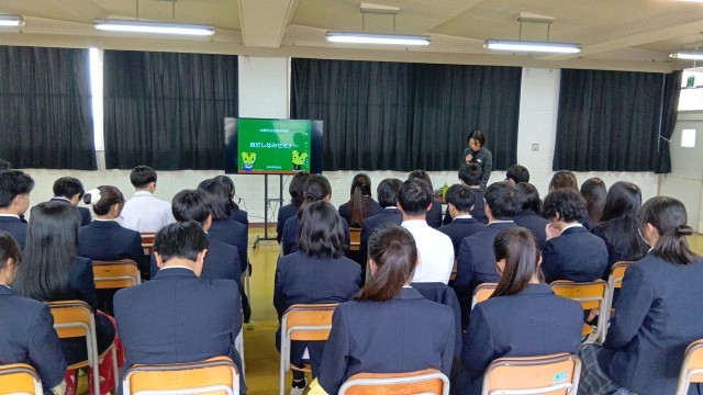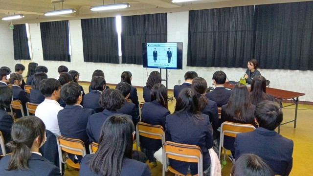 制服の意味や身だしなみについて、本校の制服を作っていただいている瀧本株式会社の方にお話をしていただきました。