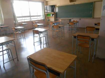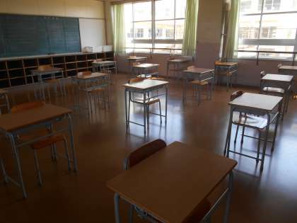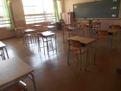 5月8日(金)に今週に予定されている学年ごとの登校日の準備をしました。教室の机は、1クラスを半分に分けて使うので、感染防止の意味で普段の倍ほどの間隔をあけています。