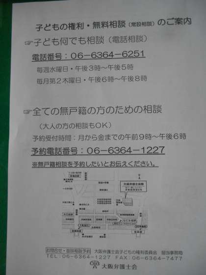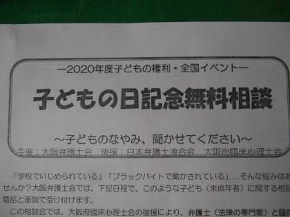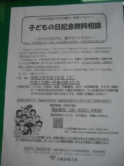 市教育委員会より、大阪弁護士会による「子どもの日記念無料相談」の案内が届きました。5月16日(土)と日が近いので、ホームページでお知らせします。「この悩み、法律で解決できないの?」「「私のつらい気持ちを聞いてほしい。」そんな思いがある人はぜひ、電話をしてください。相談内容は、いじめ、不登校、体罰、児童虐待その他となっています。子どもでも大人でもかまいません。弁護士さんに電話でしかも、無料で相談できます。心配ごとがあれば、ぜひ、電話してください。