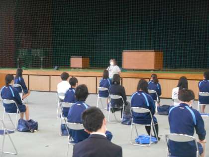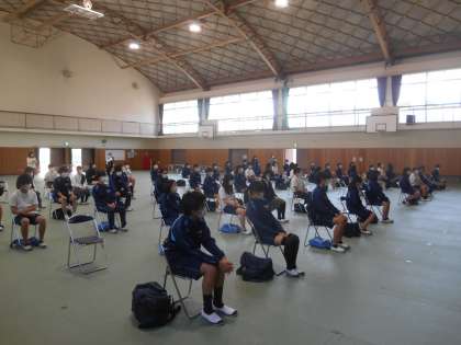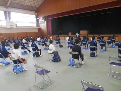 いよいよ学年集会が始まりました。学年主任の先生が、「ほんまに、久しぶりです。元気でしたか。」と切り出し、話し始めました。こんな当たり前のことなのに、ジーンときました。当たり前のことが本当にうれしいですね。校長からは、1.3年生をほめること。2、元気確認。3、一人で悩みを抱え込まないこと。4.休校中のメールやイラストへの感謝の話をしました。