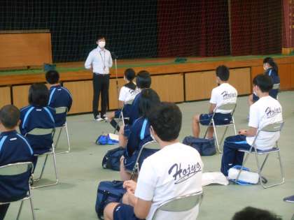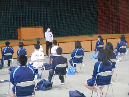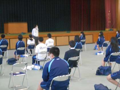 続いて学年の先生からの話です。休校中には授業準備や身体がなまっていはいけないので、「中山きんにくん」のビデオを見て、筋トレした話、2年生の数学について、数年前に海外青年協力隊でアフリカの国へ行ってきたことを「総合の時間」に活かしたいの話などをしているところです。