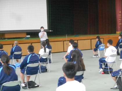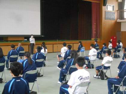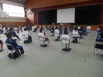 校長の話に続き、学年の先生の話が始まりました。校長の話では、先日小学校の校長先生から電話があって、小学生の登校に付き添ってくれた中学生がいたんです、うれしかったです、の話があって、それを一番に紹介しました。すばらしい話です。学年の先生からは、久しぶりの1年生担当で気持ちを引き締めてやりますの話。1年生のあなたたちと出会えてめちゃくちゃうれしい、待ちに待ってましたの話。私も今年から北条中に勤めます。がんばりますの話。休校中は授業の準備もしたけど、それでも時間があって、テレビドラマの「JIN 仁」を見て、とても面白かったの話、などがありました。その中で、先生が「休校中に一生懸命勉強した人は手を挙げて。」という問いに2人の人が手を挙げました。すばらしい。