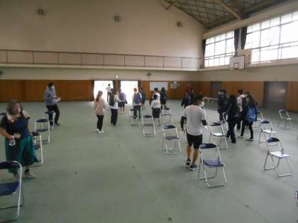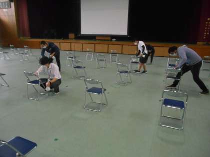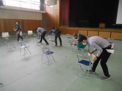 学年集会後に消毒を行いました。3日目なので、先生たちも慣れてきました。