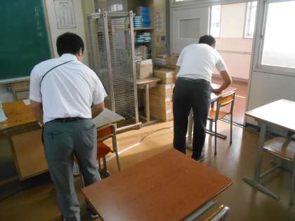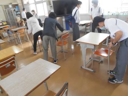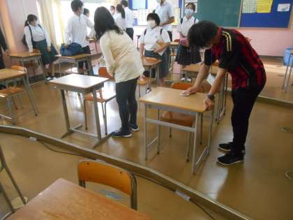 3年生が下校し、使った教室等の消毒作業をしています。皆さん、明日もがんばりましょう。