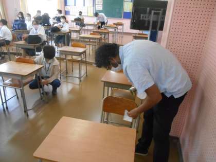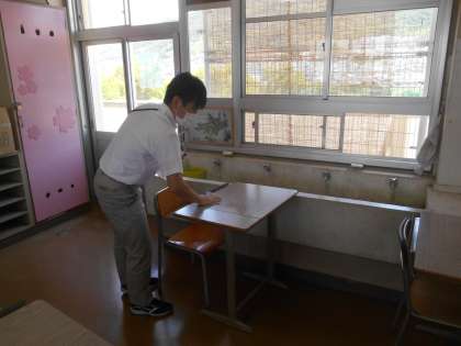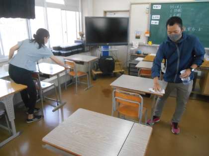 1、2年生が下校していく中、教室の消毒をする先生たちです。