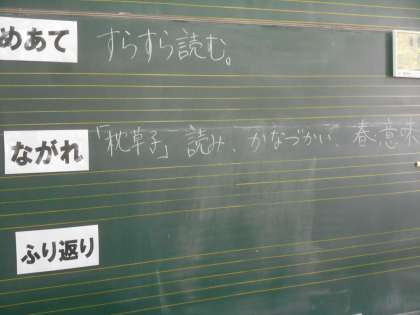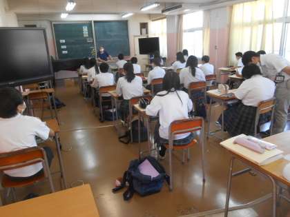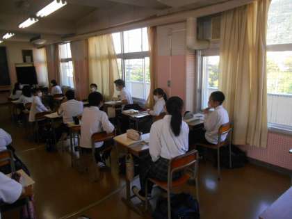 枕草子を勉強しています。3枚目は、隣の人と「あけぼの」とは、一日のうちのどの頃(時間)のことか、意見交流をしているところです。こういったシーンで、スムーズにペアの人と言いあえるのが北中生のすばらしいところです。もちろん、今は近づきすぎないように気をつけています。