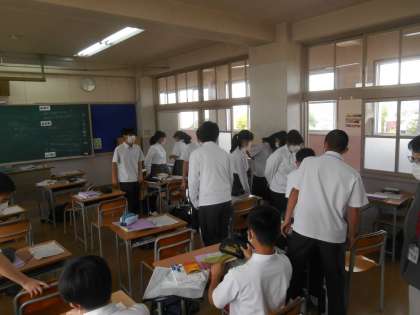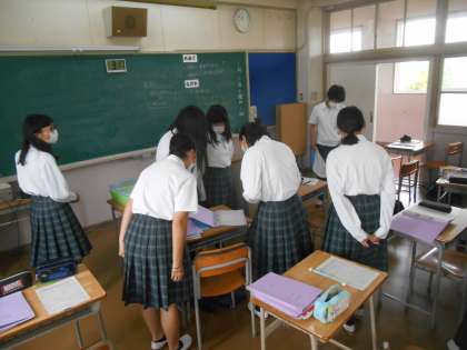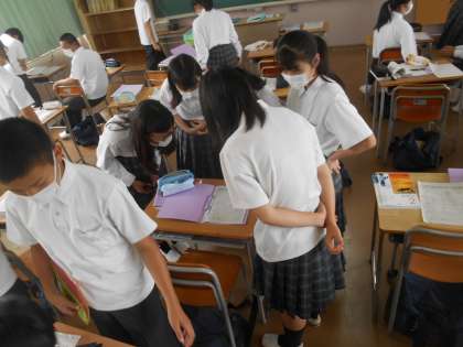 この写真は、互いの説明を終え、先生が「しっかりまとめられているプリントはとても参考になりますから、動いていいので、ぐるっと見ていってください。」と指示したときのものです。少し、密が気になりますが、何人かのノートは注目されていました。何度も書きますが、それを見て、「ああ、こうやればいいんだ。」と、みんなが伸びます。
