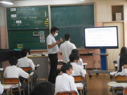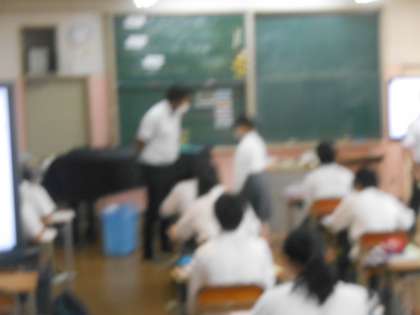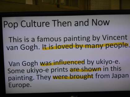 ゴッホの絵を受け身の文で紹介しようという授業です。ラストに今日習った英文を暗誦するのをAETの先生に聞いてもらっています。