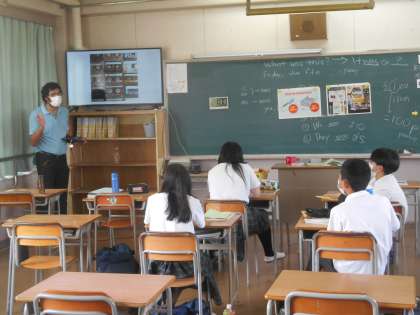 What was it? に対して、It was 〜.と答える勉強をします。古い時代のものを写真にして、生徒が「それは 〜 でした。」と英語で答えていきます。2、3枚目の写真は何か分かりますか?答えは、カセットテープと電話です。生徒から正解が出たのも驚きました。