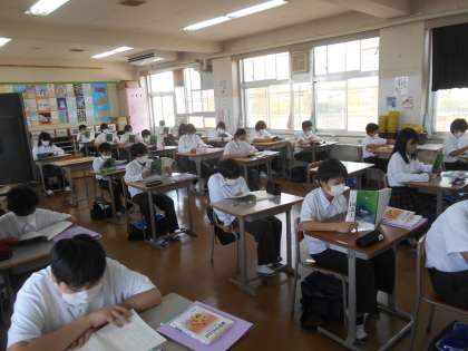 椎名誠著の「風呂場の散髪」という読み物を勉強していました。生徒が順番に読んでいるところです。