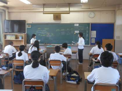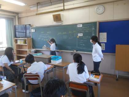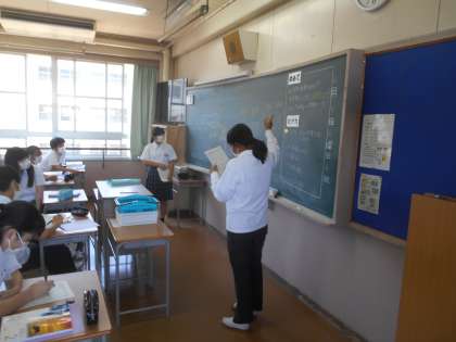 さあ、いよいよ生徒による授業が始まりました。前時までに予告されていました。他の生徒も一度習っていることを復習の意味で、生徒が説明しています。二人ともしっかりと順部をしていて、素晴らしい内容でした。また、聴いている皆さんもしーんと聞いていました。どちらもすばらしい。