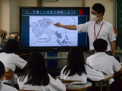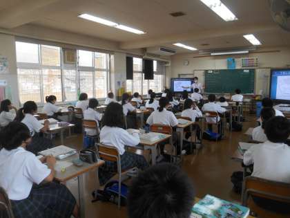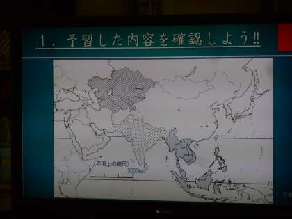 1年の社会です。世界地図を使って、先生が「ここは?」と指差し、「ヨーロッパ」(生徒)、「ここは?」「アフリカ」「ここは?」「インド」など、くり返し問答していました。自然に覚えてしまうと思います。