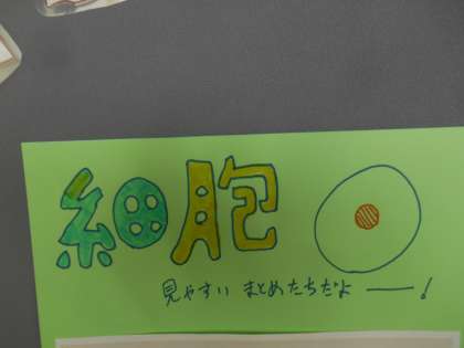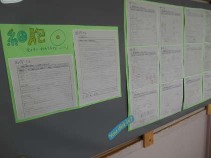 2年生の教室前の廊下に理科の時間に細胞について生徒がまとめたプリントのうち、参考になるものが掲示されていました。掲示された人は理科の力、センス、そして何より「まじめさ」に自信をもってください。見る方の人も、これを参考に次のプリントづくりに励んでくださいね。