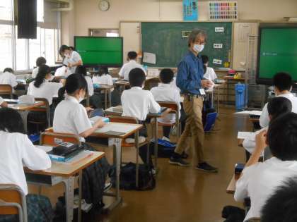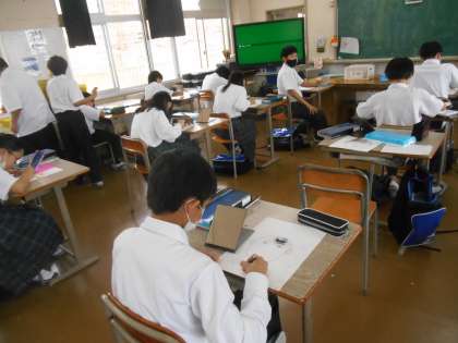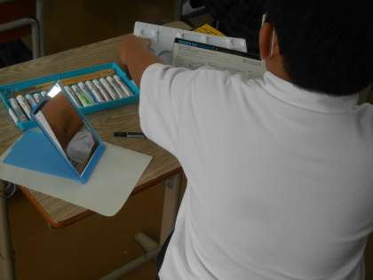 今日の美術では鏡が用意されていました。自画像を描くのに必要なようです。さっそく、「よく見て描くように。」「実物大ですよー。」と先生から言われていました。