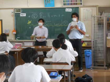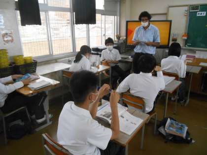 3年生の英語の授業です。今日は今まで習った部分を暗唱する時間です。